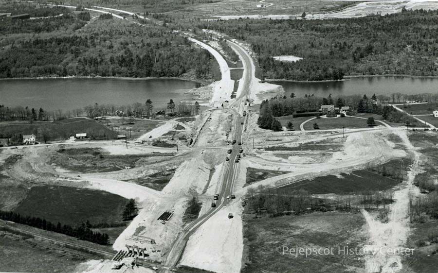 A B/W aerial photograph of the construction of the bridge over the New Meadows River, Brunswick, ME. It is now the new Route 1. Undated.