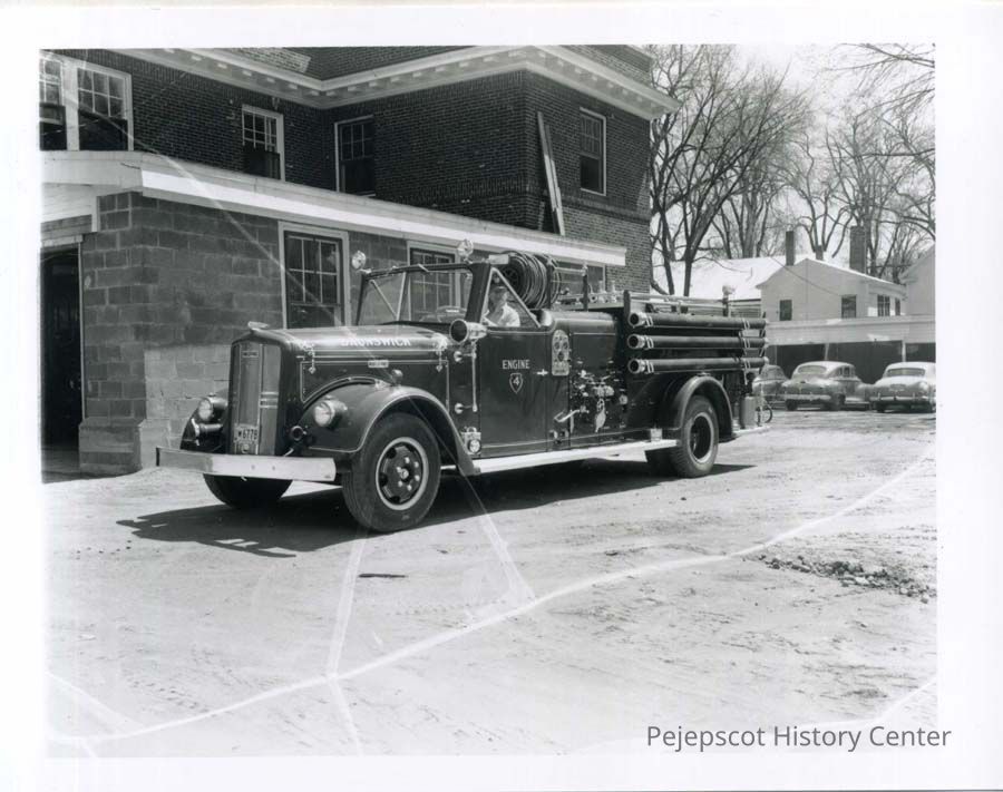 B/W photo of the new Ward Lafrance fire truck with Alfred Letarte driving. Truck is beside the fire station in back of the town hall. Three cars are in the background.