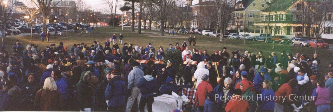 Panoramic color photograph of Brunswick, Maine's 1999-2000 New Year's celebration. The photograph shows a group of people on the town mall; the Pejepscot History Center and Skolfield Whittier House are visible in the background.Collection