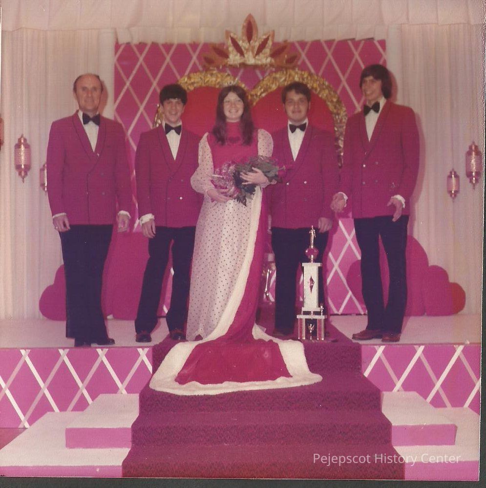 Newly elected Brunswick Teen Queen Debra Jellison with Jerry Menard M.C. and pageant escorts Robert Cloutier, Paul Bergeron and Jim Lewis.Collection