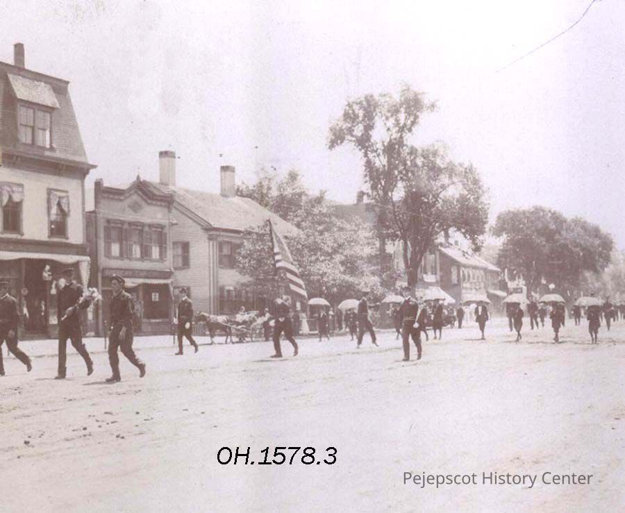 Niagara Engine Co. in the Fireman's Parade at Brunswick, ME on July 4. The umbrellas which the men are carrying spell the word "Niagara 3". Photo not dated.