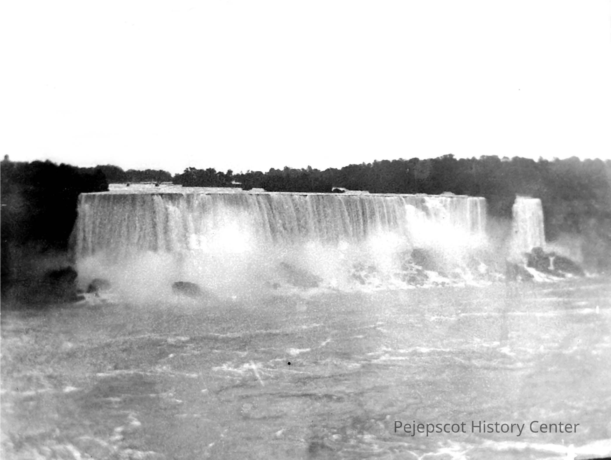 A glass plate negative with a photograph of a waterfall, presumably Niagara Falls. The negative has a sticker with "19" written on it. CD-R Glass negative Photos #24 Undated.