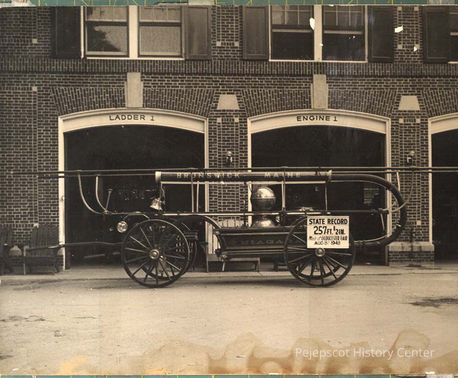 A black and white photograph of Niagara No. 3 fire truck in front of the fire station in Brunswick, Maine. The sign on the side of the engine says, "State record 257 ft. 1/2 inch. Made at Gloucester Fair August 8, 1948." Dated 08/08/1948.