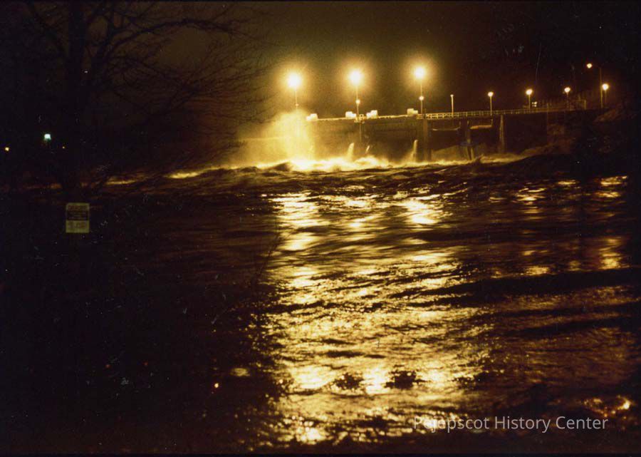 A B/W night time photograph of the Frank J. Wood Bridge and the Androscoggin River during the April 1987 Flood. Brunswick, Maine