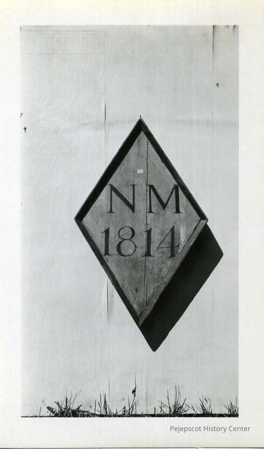 B/W photo of the 1814 sign from the Noah Melcher Inn/Tavern, currently in the possession of the Pejepscot Historical Society.