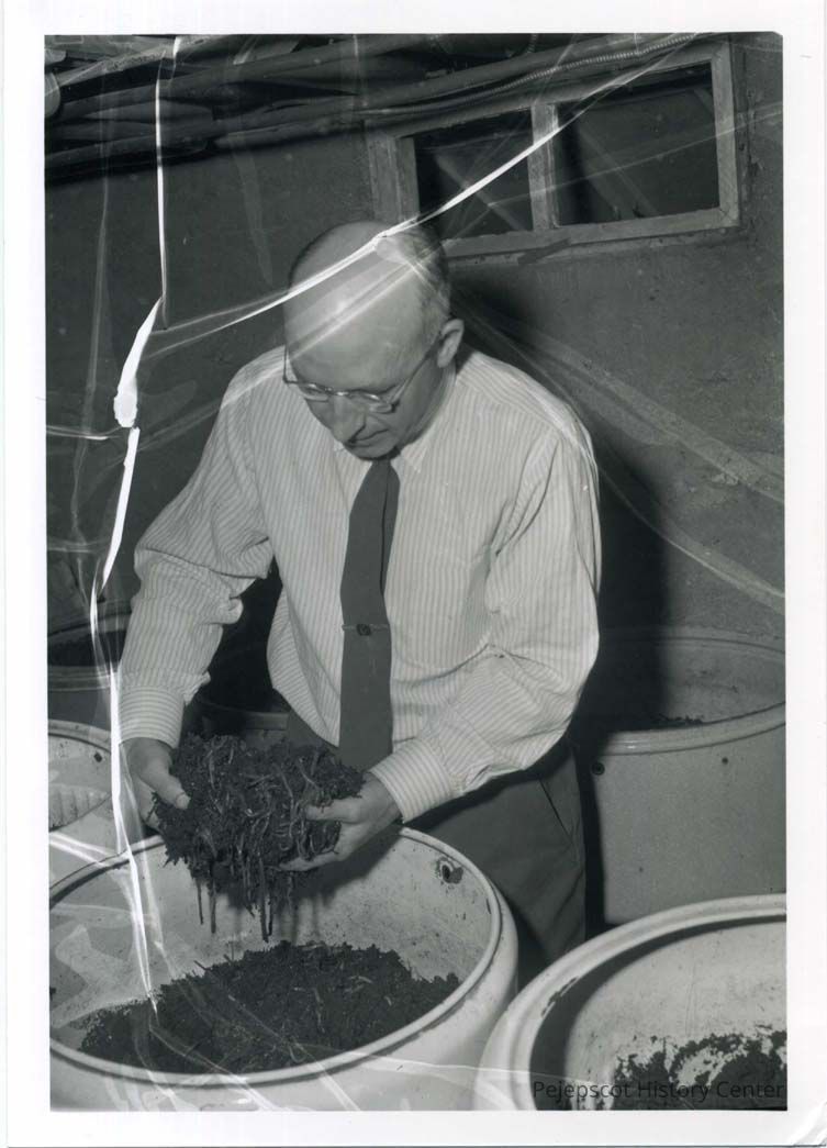 Norman W. Emerson in a basement going through pails of dirt filled with angle worms on March 23, 1955.