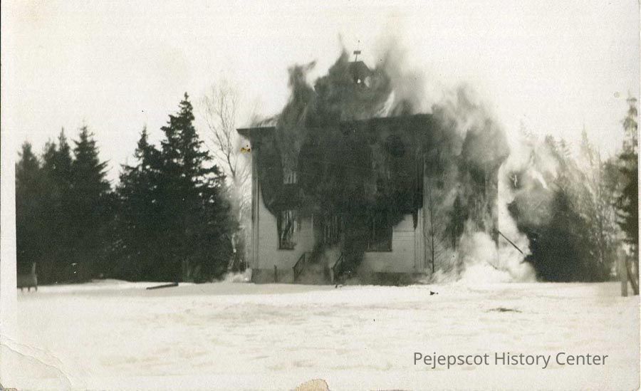 A black and white picture postcard of the North Harpswell Academy in North Harpswell on fire.Collection