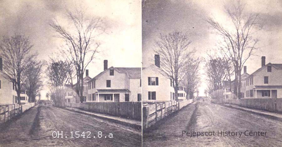 A B/W stereo view of O'Brien Street now know as Cumberland Street. in Brunswick, ME. It shows a dirt street lined with houses. Marked on the back, "1873-1880, #10 3rd on right -- Harns House; Boardman House; on left - Otis House; Wing House; Benj. Furbish House" Undated