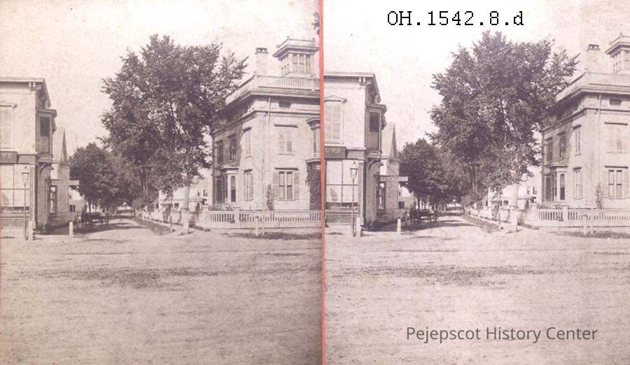 A B/W stereo view of O'Brien Street now called Cumberland Street, Brunswick, ME. It shows the corner of Maine and O'Brien Streets. Marked on the back, "O'Brien Street (now called Cumberland St.) north(?) map: to Center St. changed to O'Brien St. and then to Elliot St. O'Brien ran from Maine to Union Str." "Photographed by H. D. Adams". Undated