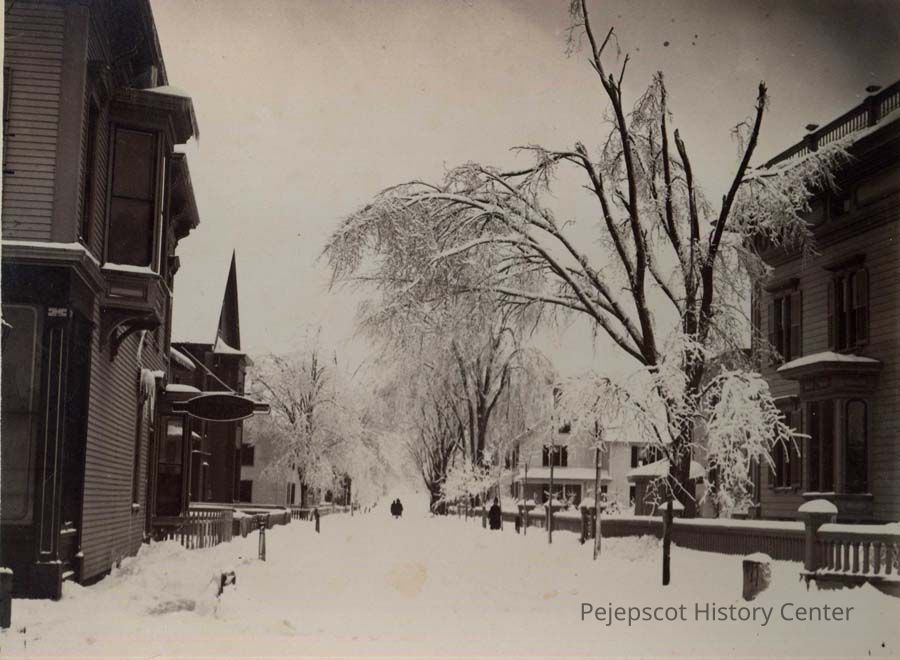 A B/W photo of O'Brien Street, Brunswick, ME (renamed Cumberland Street) during an ice storm. The road is covered in snow and the tree branches are bent low with ice. Dated 1885.