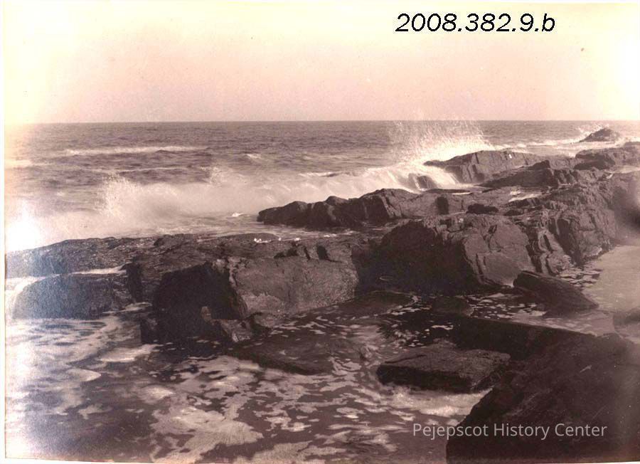 A B/W photograph of the ocean at Bailey's island. It shows the ocean waves hitting the rocks at Bailey's Island. Undated