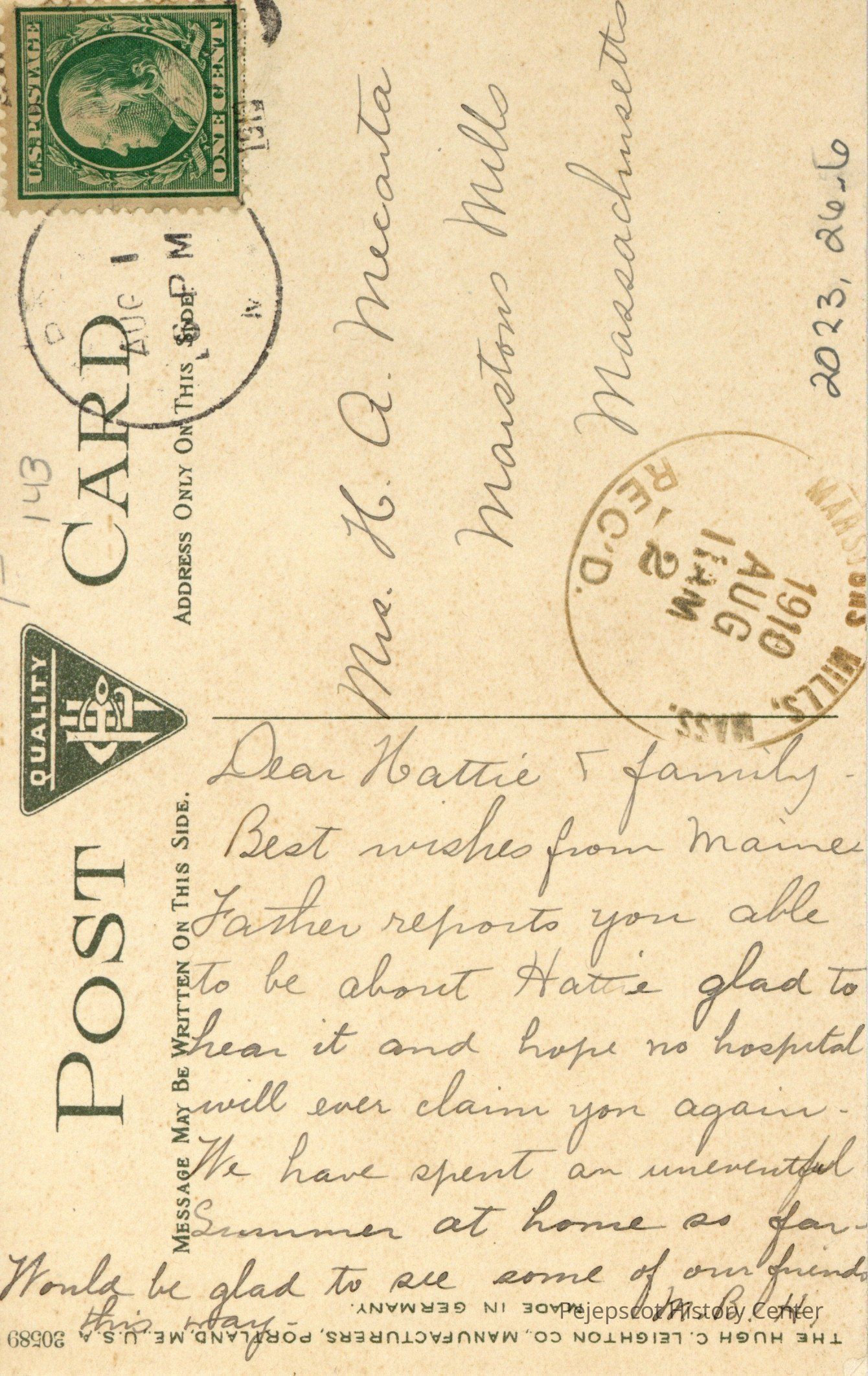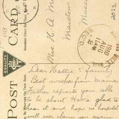 Dear Hattie & family, Best wishes from Maine. Father reports you able to be about Hattie glad to hear it and hope no hospital will ever claim you again. We have spent an uneventful Summer at home so far. Would be glad to see some of our friends this way. M. B. H.