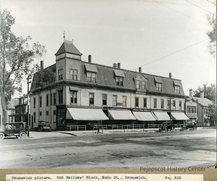 A black and white photo of Odd Fellow's Block on Maine Street in Brunswick. The photo shows several businesses: Tondreau Bro's Co., H.W. Varney Jeweler, Central Maine Power Co., Millinery. Undated