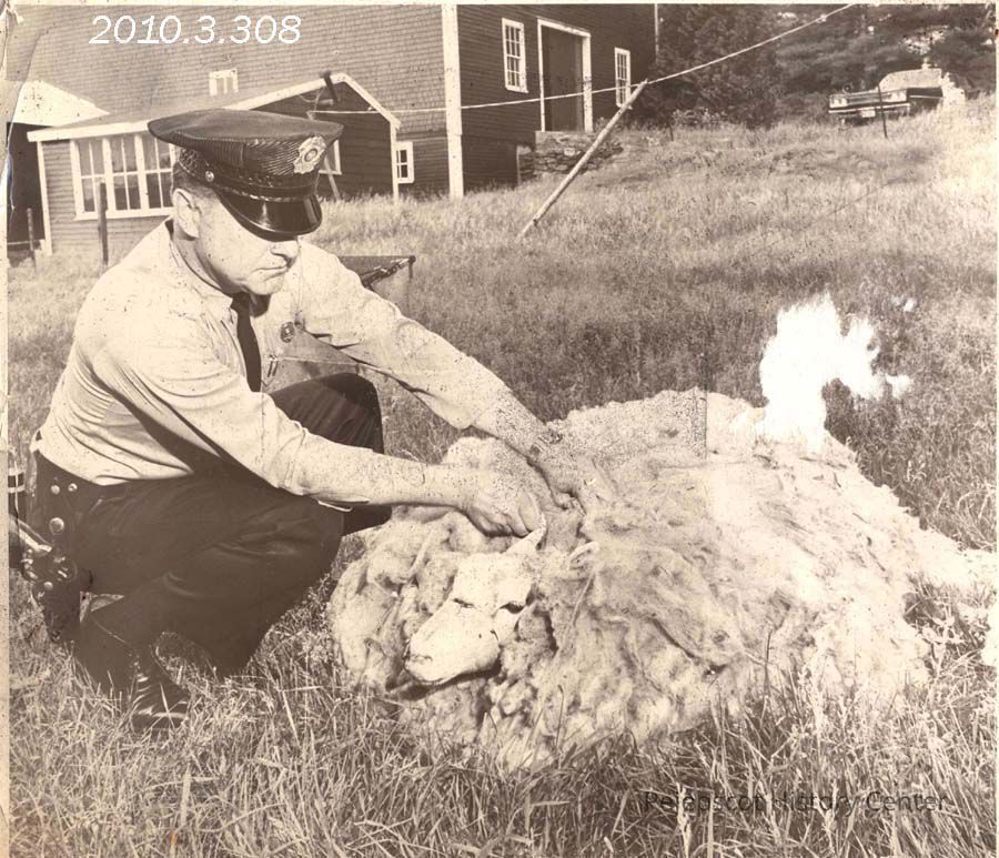 A B/W photograph of Brunswick Dog Officer John B. Marquis Jr. examining a sheep mauled by dogs. Photo was published 6/18/1969. Undated