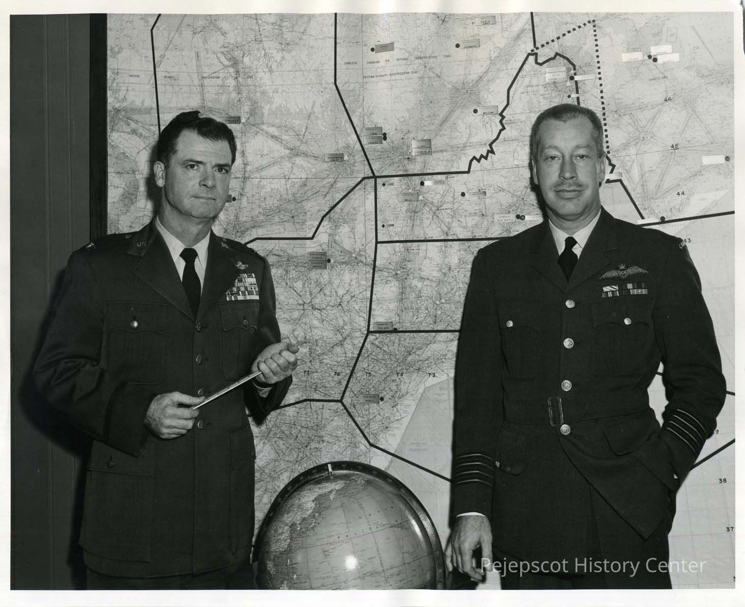 Two officers, one from the U.S. and the other from Canada, stand in front of a map of Maine with a globe between them. Undated
