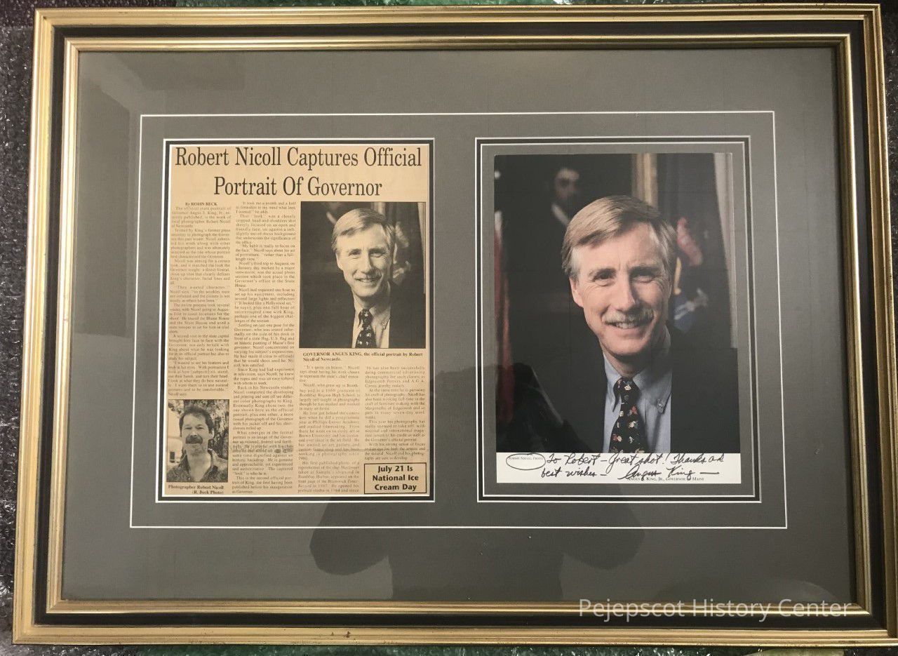 Framed official photograph of Governor Angus S. King, Jr. taken by Robert (Rob) Nicoll, a photographer from Newcastle, Maine. The photograph is signed by Governor King and states, "To Robert - Great shot! Thanks and Best Wishes! - Angus King." The photograph was taken inside the Maine State House in front of the portrait of Maine's first governor, William King. This was the second official portrait of Governor King, the first being published prior to his inauguration in 1995.