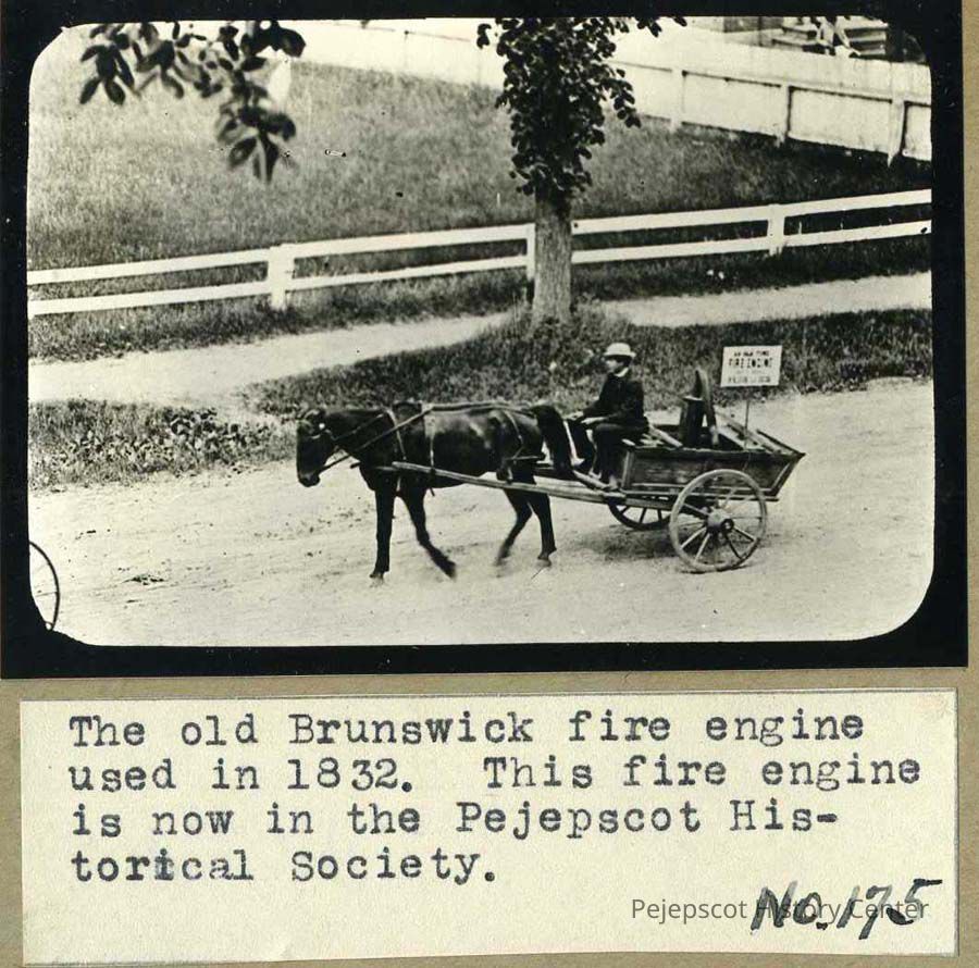 A black and white photo of the old Brunswick fire engine used in 1832. The fire engine is made up of a horse drawn cart with a man driving and a hose of some sort in the cart. This photo shows the fire engine being driven down a street. The fire engine itself is now in the Pejepscot Historical Society. Undated