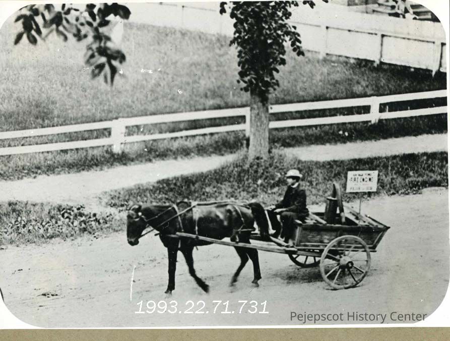 A B/W photograph of the Old Brunswick Fire Engine. This engine was used in 1835. Pictures are in an album, titled, "Brunswick Maine Pictures Book No. 2, Groups, Streets and Buildings." The photos were produced from a lantern slide in the possession of PHS on 11/04/1921. UndatedCollection