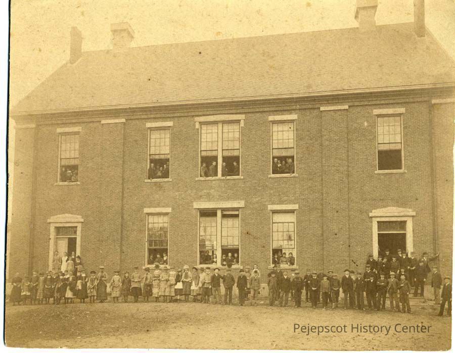 A sepia photograph of the Old Brunswick High School located at the corner of Federal & Green Streets, Brunswick, ME (where Hawthorne now stands) with student body in front and in windows. The girl's entrance is on the left and the entrance for boys is on the right. Circa 1870.