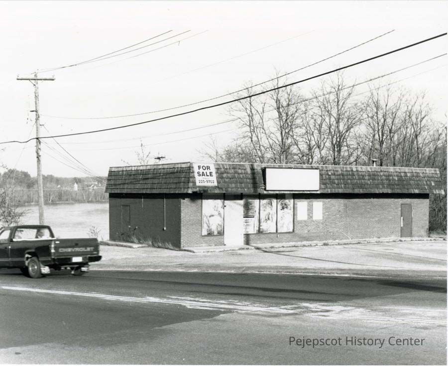 A black and white photograph of the old Cumberland Farm Store on lower Maine Street, Brunswick.