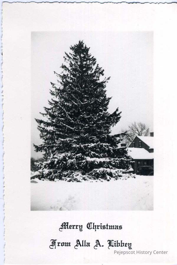 B/W photograph and Christmas card of the Noah Melcher Inn/Tavern (also known as the Old Frost Home and Half-Way Tavern) at its current location in Halifax, Massachusetts with a large conifer in front. The home was moved from Pleasant Hill Road, Brunswick (possibly referred to as the Old Portland Road in early documents) in 1940.
