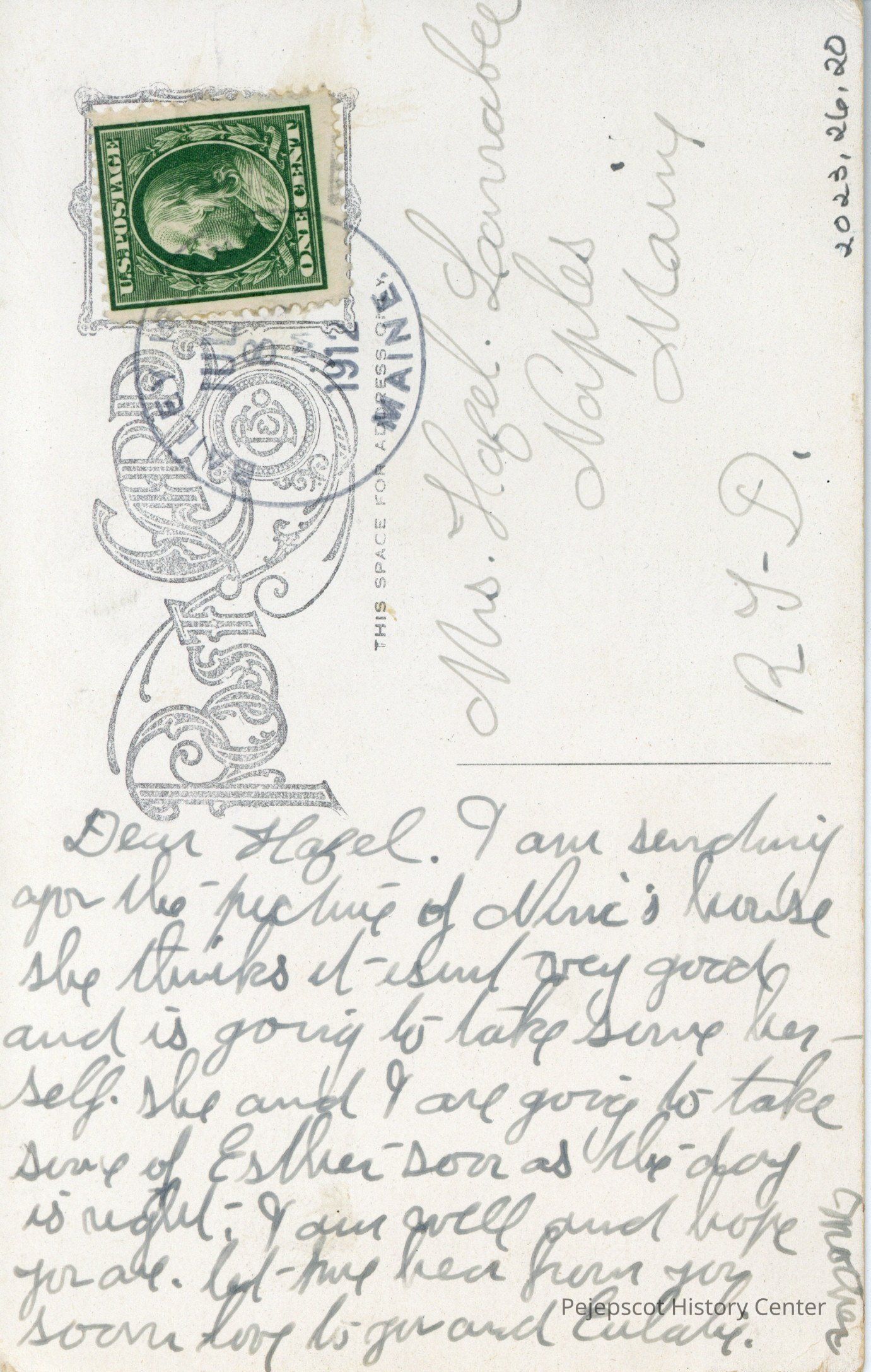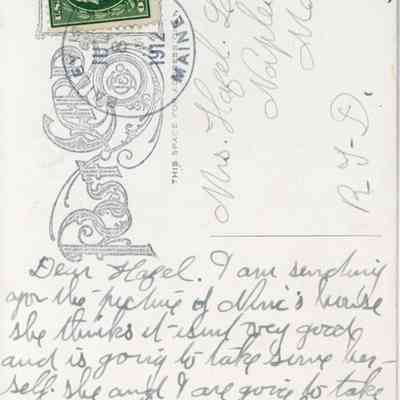 Dear Hazel, I am sending you the picture of [?] house. She thinks it isn’t very good and is going to take [?] herself. She and I are going to take [?} of Esther soon as the day is right. I am well and hope you are. [?] hear from you soon. Love to you and Eulaly. Mother