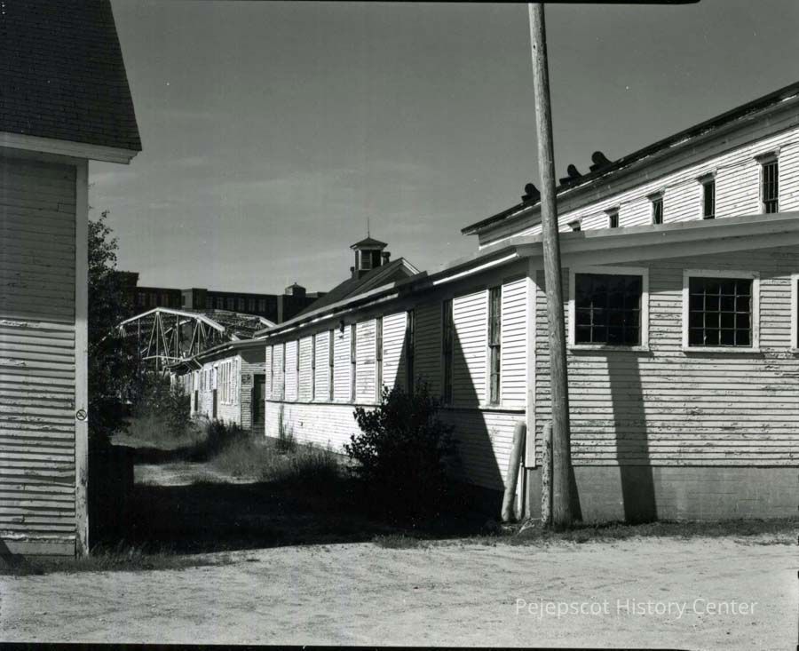 B/W photo of the Bowdoin Mill on Old Main Street between buildings 8 & 6. The Frank J. Wood Bridge in the background. No date.