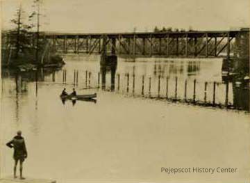 A B/W photograph of the old railroad trestle connecting Brunswick and Topsham. Undated