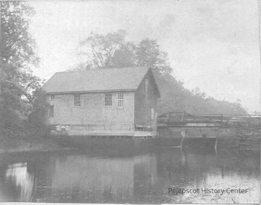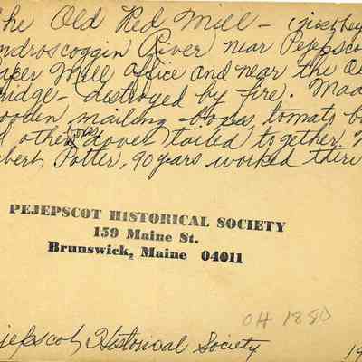 A B/W photograph of The Old Red Mill. Brunswick, ME. Marked on the back - "The Old Red Mill - (just beyond) Androscoggin River near Pejepscot Paper Mill Office and near old Bridge - destroyed by fire. Made wooden mailing boxes, tomato boxes and other boxes dove tailed together." Not dated.