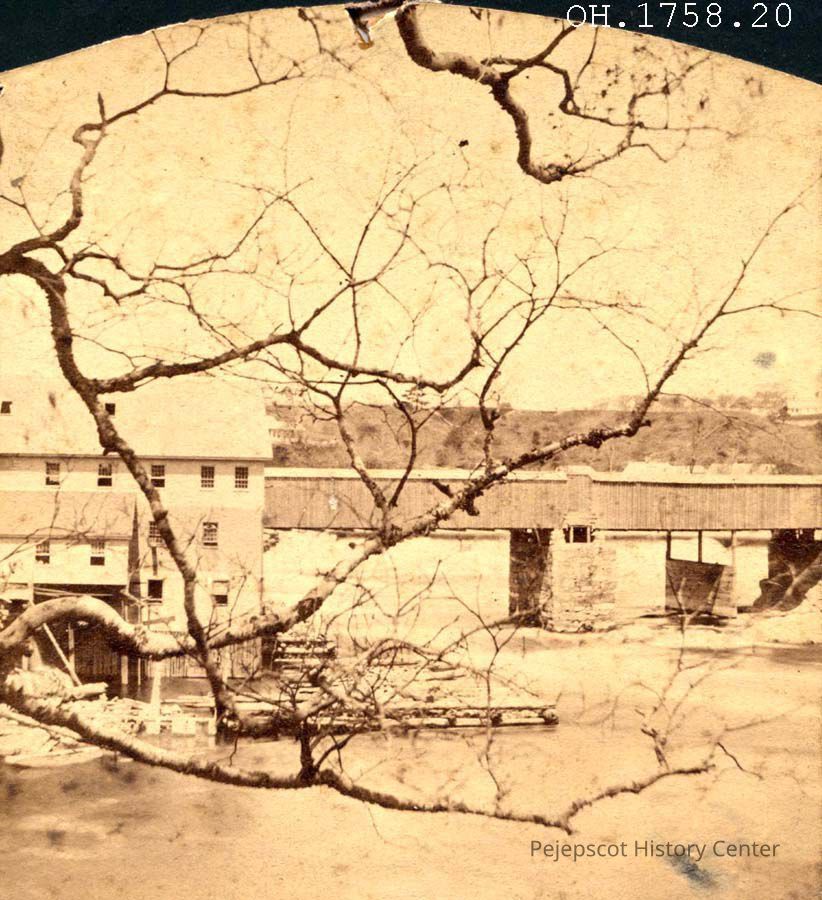 View of lumber mill (pulp mill) and old toll bridge in the cove, taken from Water Street, Brunswick, ME in 1875.