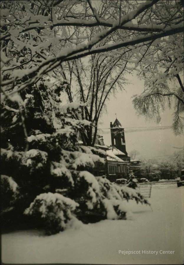 An undated black and white photograph of the Old Town Hall in Brunswick, taken from the end of the Mall in the winter.