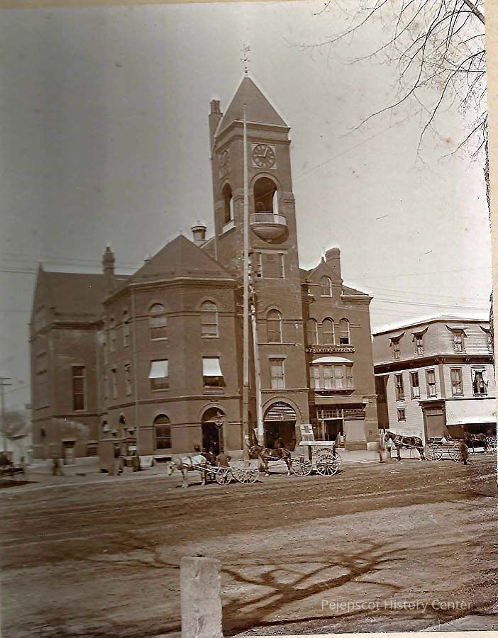 A B/W picture of the Old Town Hall. The sign on the side of the hall says, "Printing Office".