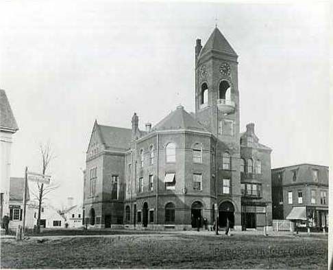 A B/W photograph of the Old Town Hall and Boardman's Store. Undated