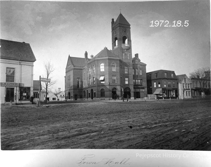 B/W photo of Old Town Hall, Maine Street, Brunswick, ME. Labeled "Town Hall" in an album entitled "Brunswick and Vicinity". The building was demolished in 1961. Dated ca. 1890.