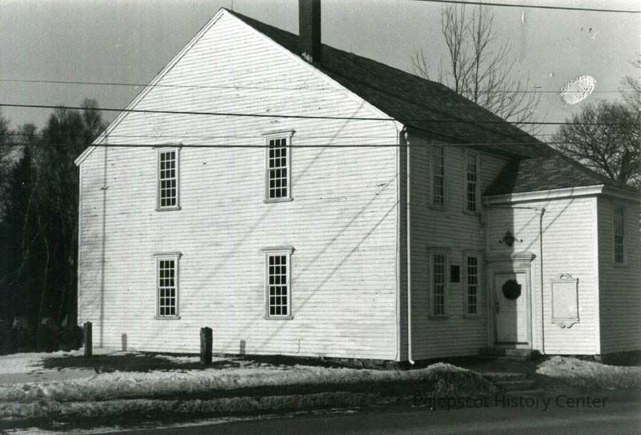 A B/W photograph of the Old Town Meeting House at Harpswell Center, Maine. Undated