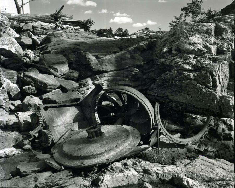B/W photo of old water turbine parts, taken along the river's edge near the Bowdoin Mill, Topsham, ME. No date.