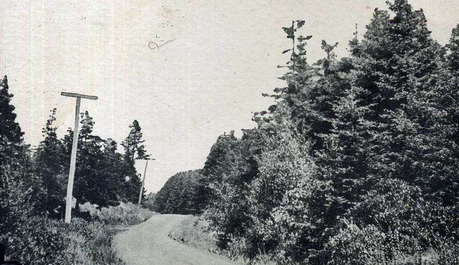 A B/W photograph of the Old Wood Road, Bailey Island.