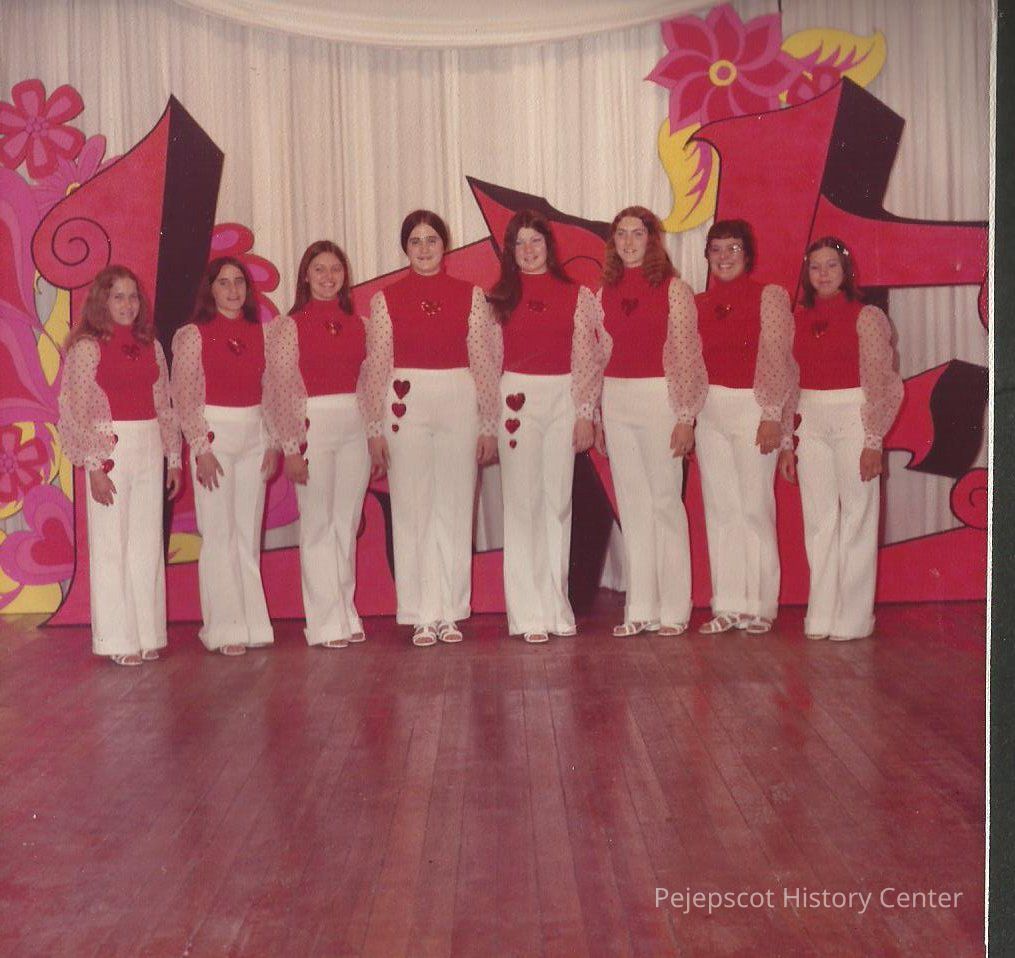 The contestants possing in the opening number costumes are L. to R. Bernadette Menard, Tami Gustafson, Linda Hinckley, Jane Thiboutot, Debra Jellison, Catherine Morhidge, Cynthia Mabb and Edythe Morgan.Collection