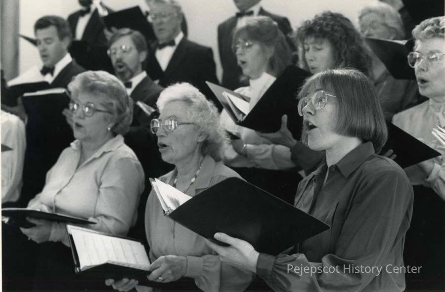 A B/W photograph of the Oratorio Choral , Brunswick. They are, l to r, Front row; Edith Mason Alice Conkey Martha Butler Back row; Andrew Bertocci Steve Amsden James Kernp Nancy Rogers Linda McCann Lavina Kernp c 1992