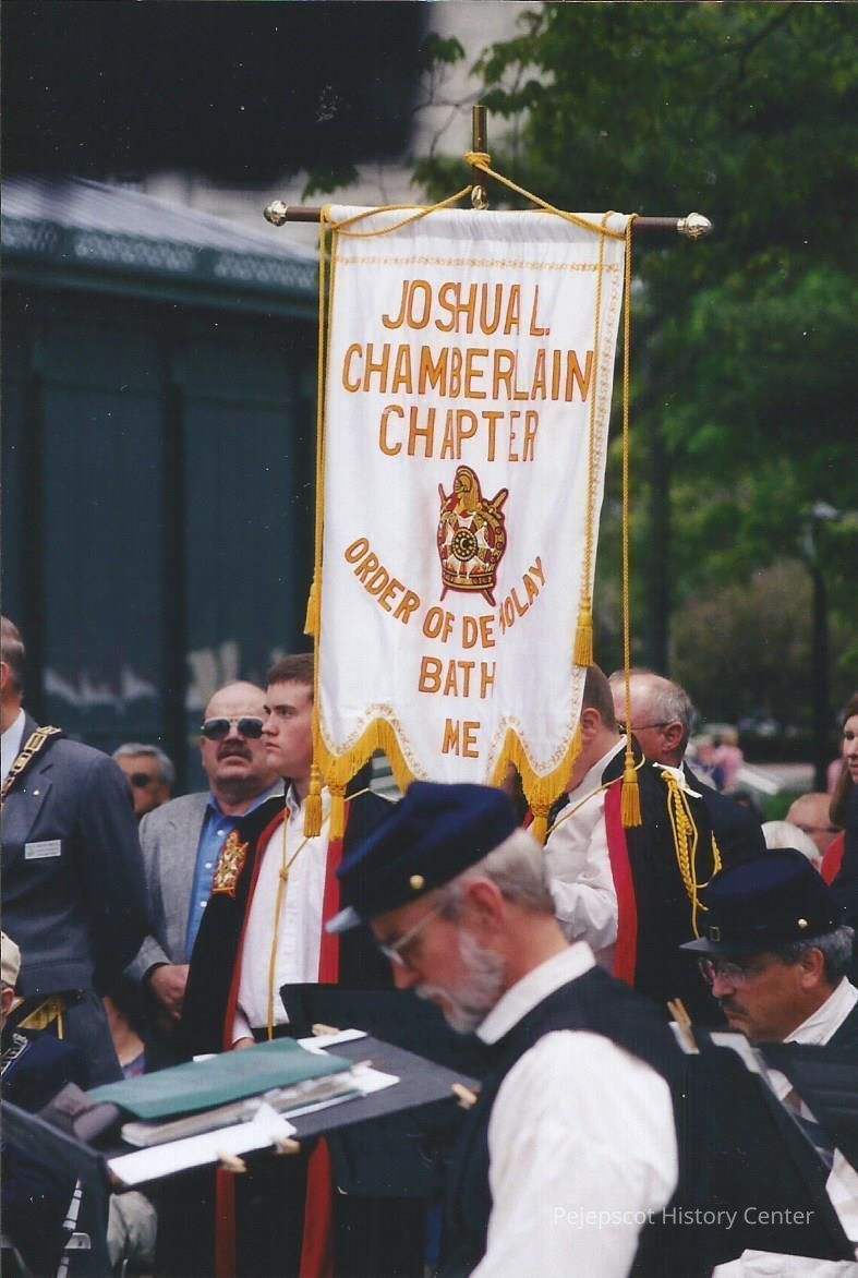 A color photograph of members of the Joshua L. Chamberlain Chapter of the Order of DeMolay, Bath, ME holding their banner at the statue dedication in Brunswick, ME. The band plays in the foreground. Undated.