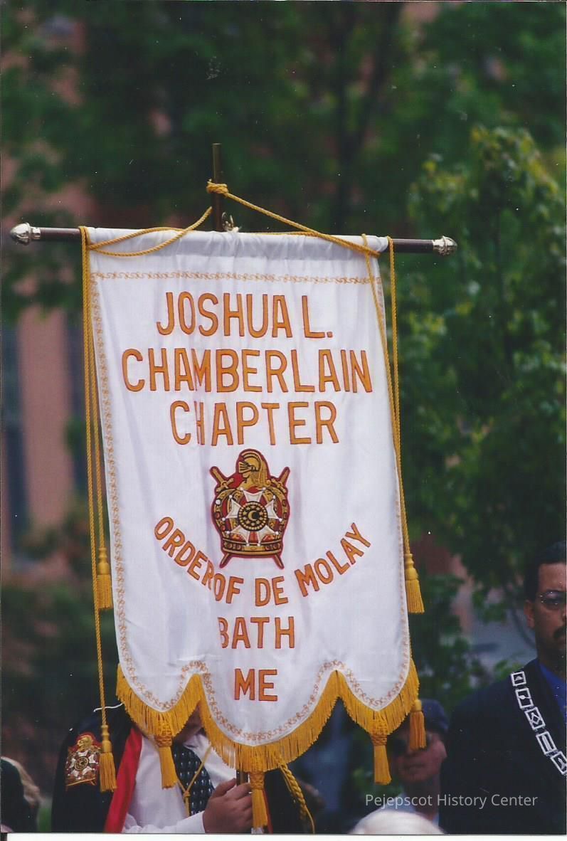 A color photograph of the DeMolay banner at the Joshua L. Chamberlain statue dedication in Brunswick, ME. The banner says Joshua L. Chamberlain Chapter of the Order of De Molay, Bath, ME. Undated.