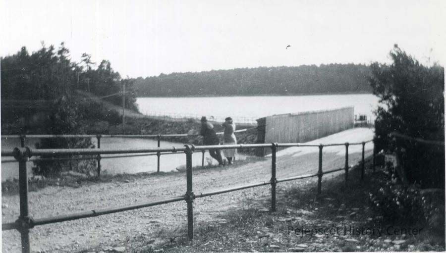 A B/W photo of an unidentified couple standing near the old wood bridge between Great Island and Orr's Island, Harpswell, Maine. Photo taken from Great Island. Photo dated 08/1923.