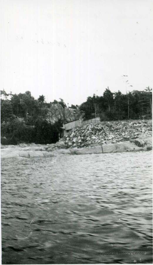 A B/W photo of the old causeway and bridge between Great Island and Orr's Island, looking east towards Great Island. Photo is taken from the water. Undated. Harpswell, Maine.
