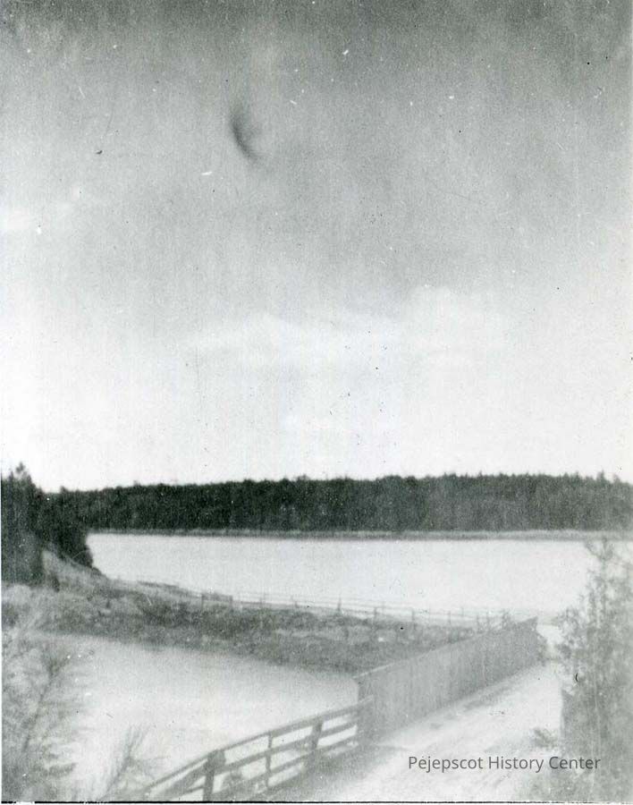 A B/W photo of the old wooden bridge between Great Island and Orr's Island. Photo is taken from Great Island, ca. 1900. Harpswell, Maine.