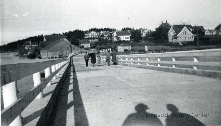 A black and white photo of several people walking across the bridge between Orr's and Bailey Islands, Harpswell, Maine.. Photo shows houses on the southern end of Bailey's Island and is dated Sunday, October 16, 1927.