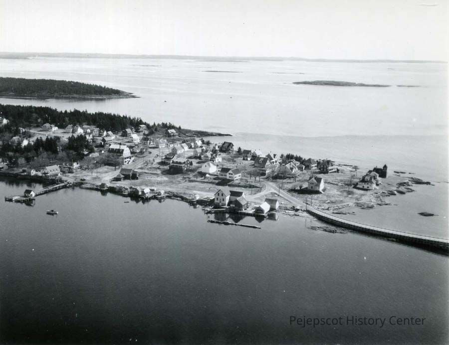 A black and white aerial photo of the southern end of Orr's Island showing the steamboat wharf on the western shore and a portion of the bridge to Bailey Island, spring 1946. Harpswell, Maine.