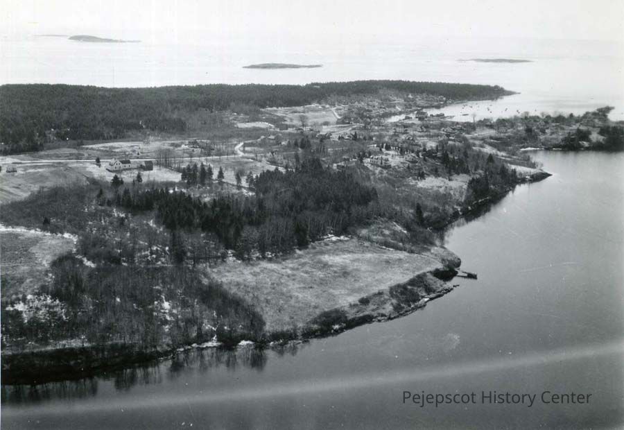A black and white aerial photo of south/central Orr's Island, Harpswell, Maine with the western shore in the foreground. Dated Spring 1946.