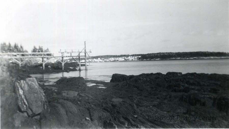 A black and white photo of the eastern shore of Orr's Island, Harpswell, Maine showing Fides wharf, dated March 13, 1949.