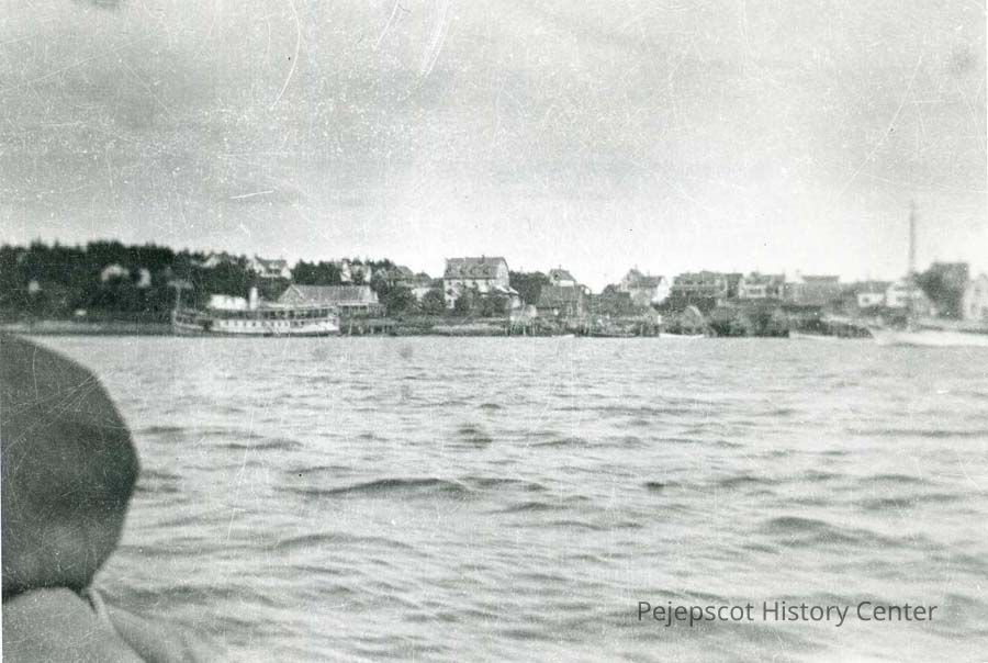 An undated black and white photo of the western shore of Orr's Island, Harpswell, Maine showing the steamboat dock near the left.