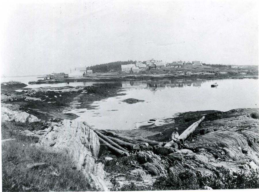 A black and white photo of the southern tip of Orr's Island taken from the northern end of Bailey's Island, Harpswell, Maine circa 1889. The two islands were later connected by a bridge in this area. A boy is seated on a large piece of driftwood in the foreground.